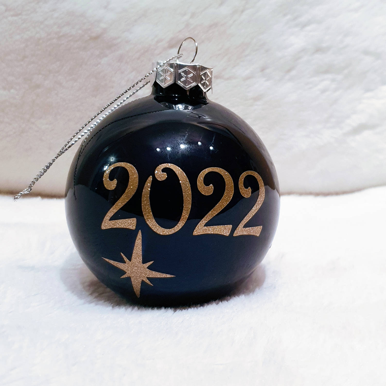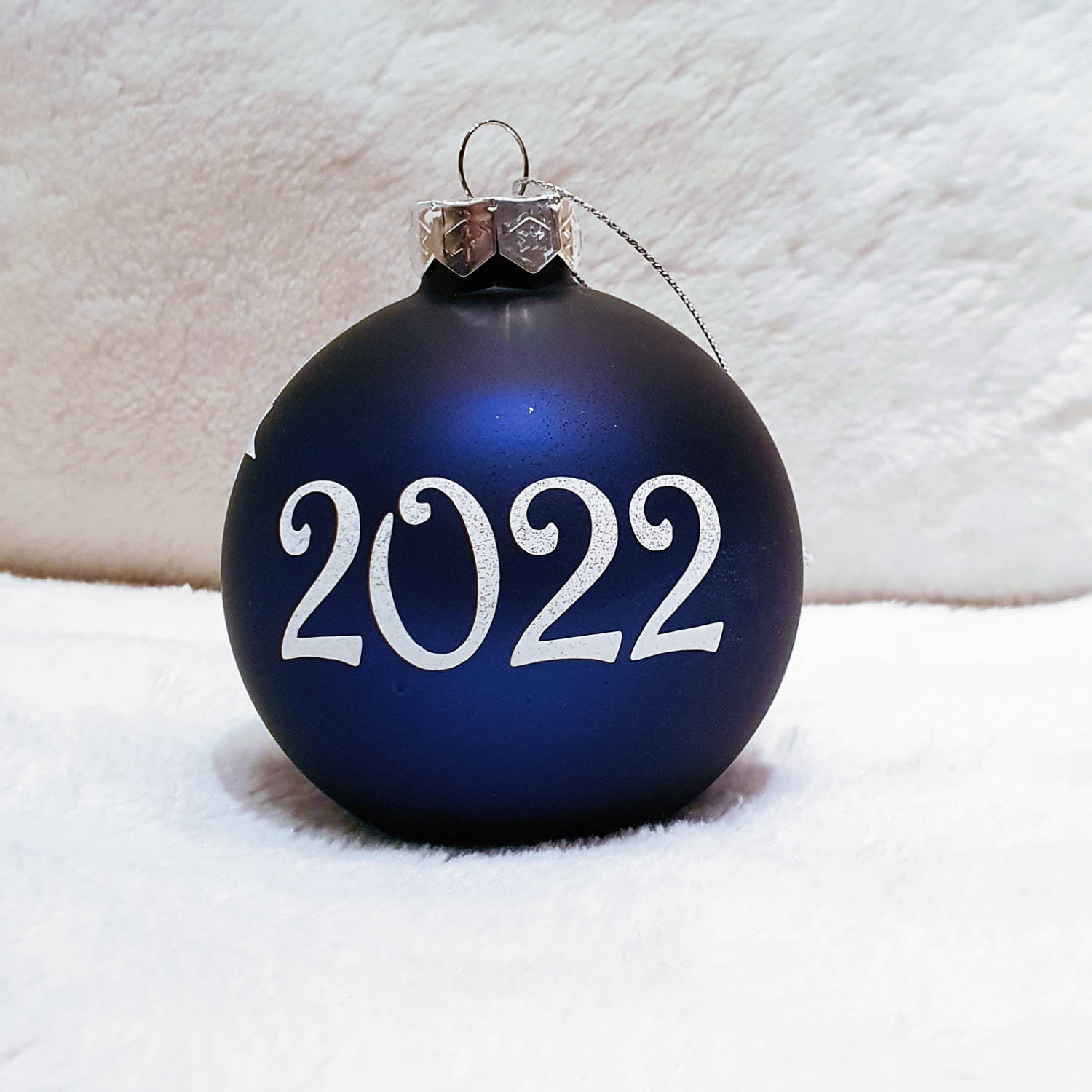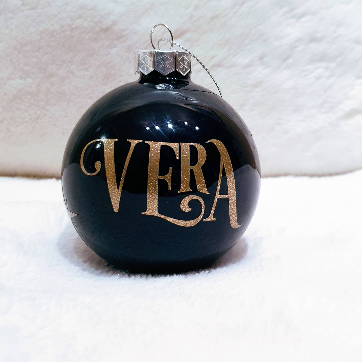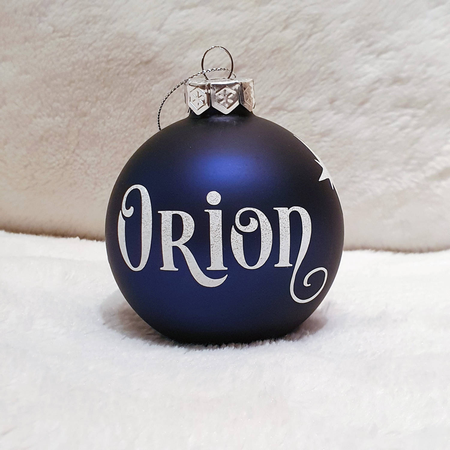 Personlig julgranskula i glas i en midnattsblå färg med valfritt namn.
